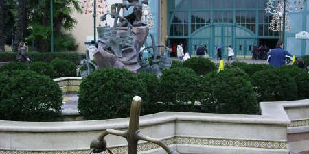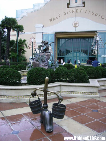 Thanks to Magic Martin and GemGoth for the photographs.Fora do Studio 1 no Walt Disney Studios está a fonte do Aprendiz de Feiticeiro. Conta com um Mickey no meio e esfregonas com baldes a dançar à volta. Gosto da ideia de que isto pretende caracterizar a cena do filme em que tudo está molhado, o que dá uma imagem engraçada quando o chão do parque está mesmo molhado, como na foto abaixo.